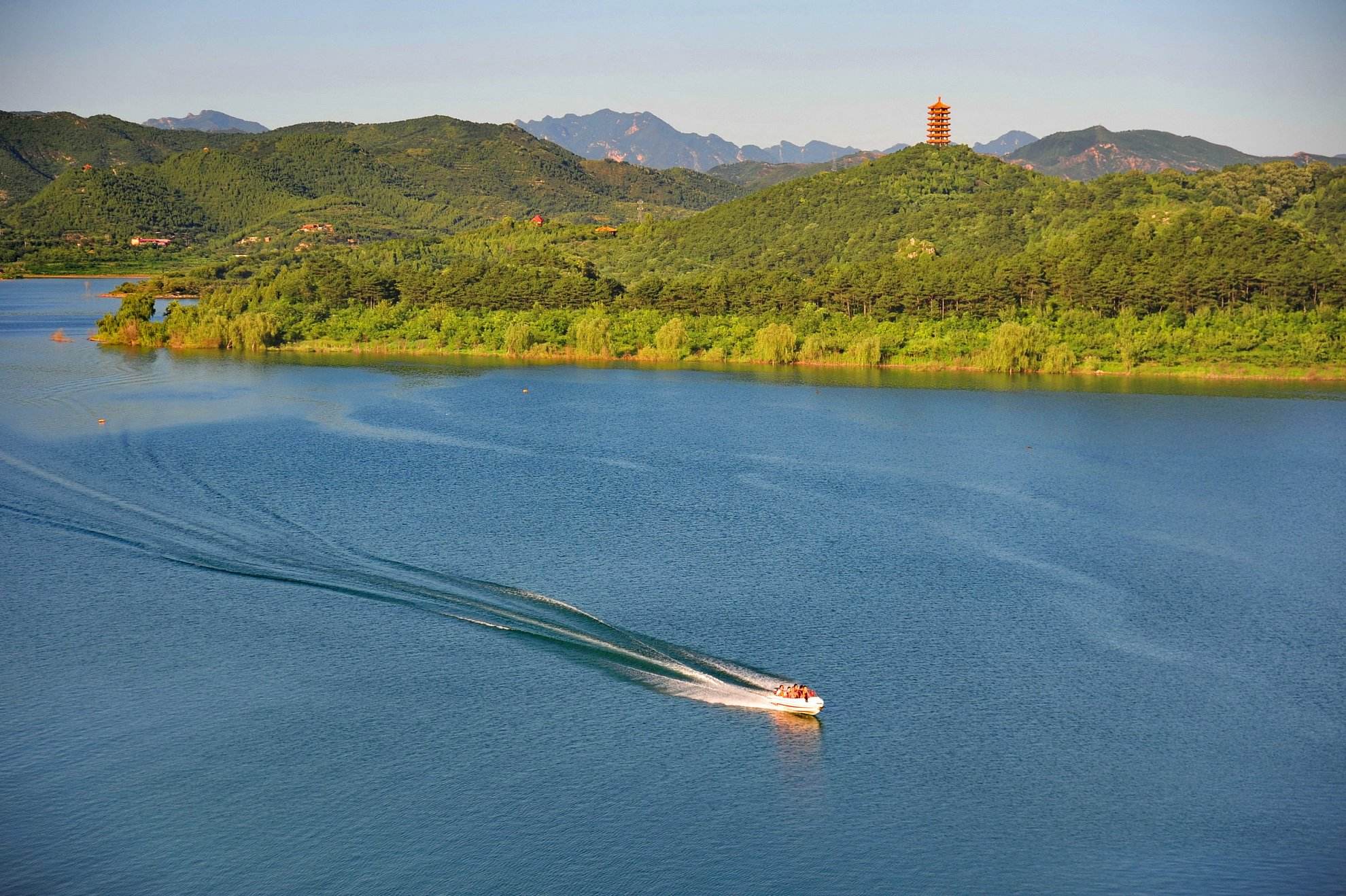 金海湖风景区位于平谷区城东15公里处,距北京85公里,水域面积6.5平方公里,是北京地区水域面积最大的综合性水上娱乐场所,现为市级风景名胜区和市级旅游度假区。金海湖三面环山,峰峦叠翠、风景秀丽。有千岛湖的湖观山色,又有兔耳岭的怪石嶙峋,有湖光塔、金花公主墓、望海亭、锯齿崖等自然景观、人文景观数十处。金海湖水域宽阔、碧波万顷,是开展水上运动娱乐项目的理想之所。这里有游船、快艇、自驾艇、水上飞、水上飞伞、脚踏船、手划船、肥仔船、速降、大型水滑梯、赛龙舟、香蕉船、橡皮艇、皮划艇、甲壳虫跑车等30余种丰富多彩的娱乐项目。